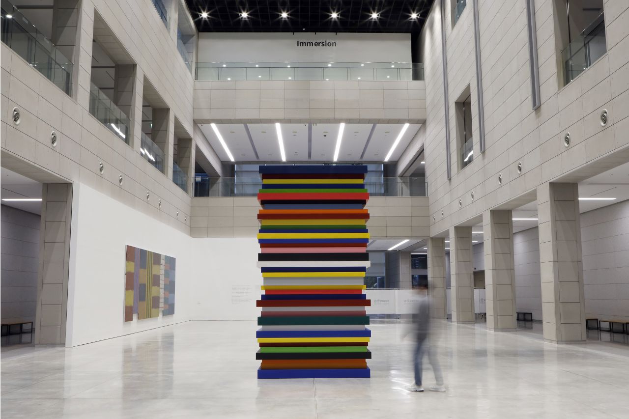 전시장에는 작가의 다양한 시기별 작품들과 더불어, 이번 전시를 위해 새롭게 제작된 조각 작품도 함께 공개된다. 4미터 높이의 대형 철 조각 과 알루미늄 프레임을 색으로 쌓아 올린 <38>은 미술관 야외 공간과 어미홀에 각각 설치되어, 평면을 넘어선 그의 조형 언어를 입체적으로 경험하게 한다.