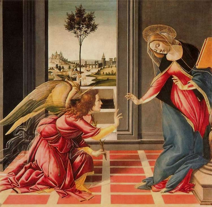 산드로 보티첼리의 <수태고지>(1489)는 그의 섬세한 스타일을 잘 드러낸 작품이다. 보티첼리는 이 작품에서 천사 가브리엘과 성모 마리아의 만남을 평화롭고 고요한 분위기 속에서 그렸다. 마리아는 기도하는 자세로 손을 모은 모습에서 순수한 신앙심을 드러내며, 가브리엘은 부드러운 손짓으로 메시지를 전달한다. 그의 자세는 겸손하면서도 경건한 존재감을 강조하며, 마리아가 하나님의 뜻을 받을 준비가 되어 있음을 암시한다.